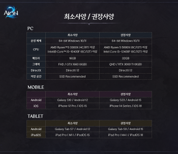 AION2 디바이스별 최소사양 / 권장사양 안내
